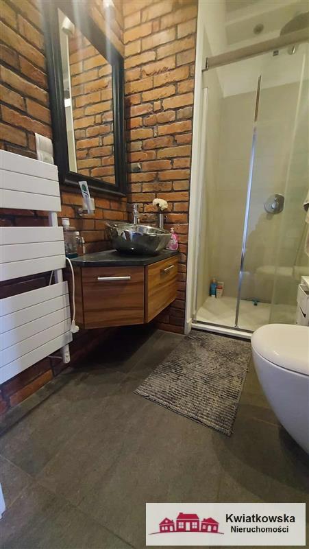 • Łazienka: nowoczesna, wykończona w stylu minimalistycznym, z kabiną prysznicową typu, pralką i eleganckimi detalami.